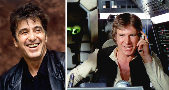 Πρέπει να ευχαριστούμε τον Πατσίνο που απέρριψε τον ρόλο του Χάρισον Φορντ στο μοναδικό «Star Wars» γιατί ειλικρινά δεν μπορούμε να διανοηθούμε άλλον πρωταγωνιστή στη θέση του! Ο Πατσίνο, που είχε περάσει μπόλικα χρονάκια ως Μάικλ Κορλεόνε («Νονός») στα μάτια του κοινού, είχε τους ενδοιασμούς του λοιπόν για το κατά πόσο θα «περνούσε» ως Χαν Σόλο, γι’ αυτό και είπε τελικά το μεγάλο «όχι»…