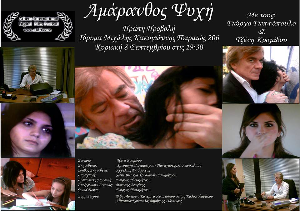 Την πρεμιέρα της κάνει η ταινία της Τζένης Κοσμίδου «Αμάρανθος Ψυχή» την Κυριακή 8 Σεπτεμβρίου στις 19:30 στο Ίδρυμα Μιχάλης Κακογιάννης στα πλαίσια της συμμετοχής της στο 3ο Διεθνές Φεστιβάλ Ψηφιακού Κινηματογράφου Αθήνας.