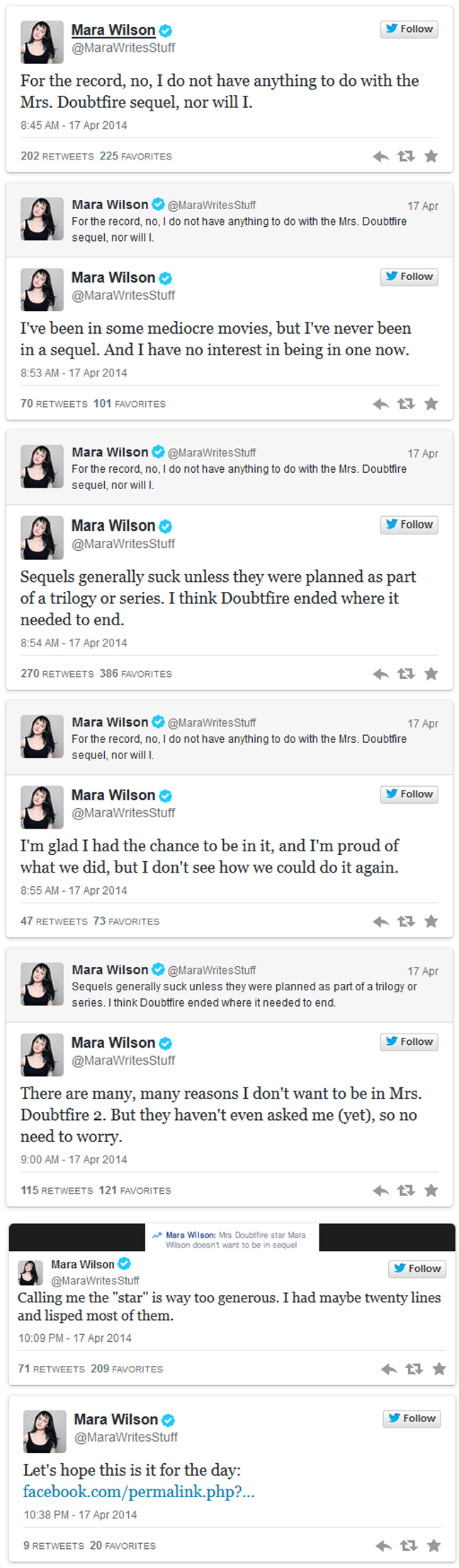 «Έχω κάνει κάποιες μέτριες ταινίες αλλά ποτέ sequel. Και δεν ενδιαφέρομαι να συμμετάσχω τώρα. Τα sequel είναι γενικά χάλια εκτός και αν είναι σχεδιασμένα να γυριστούν στο πλαίσιο μιας τριλογίας ή κάτι τέτοιο. Πιστεύω πως η Mrs. Doubtfire τελείωσε όταν έπρεπε», έγραψε.