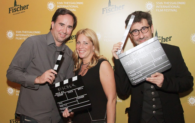 6. Γιώργος Μακρυγιαννάκης, Marketing Manager της Fischer και η Ειρήνη Σπανού, Υπεύθυνη Δημοσίων Σχέσεων της Αθηναϊκής Ζυθοποιίας, με τον Τέλλο Φίλη, εκπρόσωπο της εταιρίας SEVEN Films