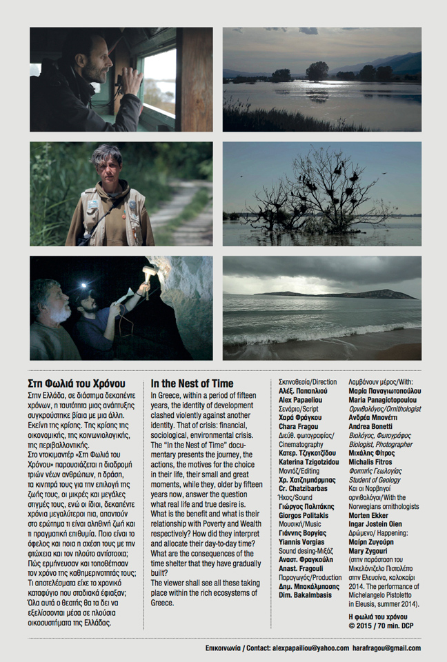 Το ντοκιμαντέρ «Στη φωλιά του χρόνου», διάρκειας 70’, είναι μια αυτοχρηματοδοτούμενη ανεξάρτητη παραγωγή. Έγινε σε πνεύμα δημιουργικής συνεργασίας, αλληλεγγύης, επαγγελματικής ευσυνειδησίας και έμπνευσης.