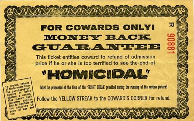 Ένα ακόμα κομμάτι του κάστρου της ιδιοφυίας αποτέλεσε η ταινία «Homicidal» η οποία κατά το διάλλειμα αποφάσιζε να ξεγελάσει τους θεατές. Επί της οθόνης προβαλλόταν ένα ρολόι αντίστροφης μέτρησης για να προσδώσει την κατάλληλη ένταση μαζί με ένα σημείωμα που προειδοποιούσε τους θεατές να αποχωρήσουν σε περίπτωση που δεν άντεχαν να δουν το φρικιαστικό τέλος. Όσοι ευκολόπιστοι αποφάσιζαν να πράξουν τα δέοντα όμως έχαιραν μιας όχι και τόσο θερμής υποδοχής καθώς έβγαιναν έξω. Στο χάρτινο περίπτερο που είχε δημιουργηθεί με σκοπό να τους επιστρέφει ένα μέρος της τιμής του εισιτηρίου, το οποίο ονομαζόταν η γωνιά του δειλού, οι θεατές άκουγαν διάφορους ταπεινωτικούς χαρακτηρισμούς προτού μαζί με τα χρήματά τους λάβουν και το σημείωμα που έγραφε «Αποκλειστικά για δειλούς»…
