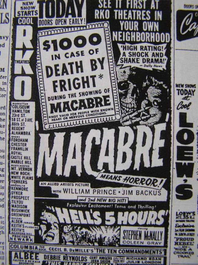 Όταν η ταινία Macabre άρχισε να προβάλλεται στην μεγάλη οθόνη το διαφημιστικό πόστερ έγραφε, «Μacabre means horror» (Macabre σημαίνει τρόμος). Εκτός από αυτό όμως ανακοίνωνε και όλα όσα είχαν φροντίσει να πράξουν πριν την προβολή της ταινίας σκηνοθέτης και παραγωγός, ούτως ώστε να διασφαλίσουν τους θεατές και κατ΄ ουσία να αυξήσουν τις προσδοκίες του κοινού και συνάμα τα εισιτήριά τους. Βασικοί και μη συντελεστές της ευφυούς παραγωγής, έκαναν μια ασφάλεια ζωής 1000 δολαρίων για την περίπτωση που κάποιος από το κοινό… τρομοκρατούνταν μέχρι θανάτου, στην κυριολεξία. Για να προσθέσουν το ανάλογο κλίμα μάλιστα μέλη του συνεργείου υποδύονταν τους γιατρούς ενώ είχαν μισθωθεί ασθενοφόρα να περιμένουν έξω από το κινηματογράφο. Με αυτό το ιδιαίτερο marketing η ταινία απογειώθηκε και οι αίθουσες ήταν ασφυκτικά γεμάτες.