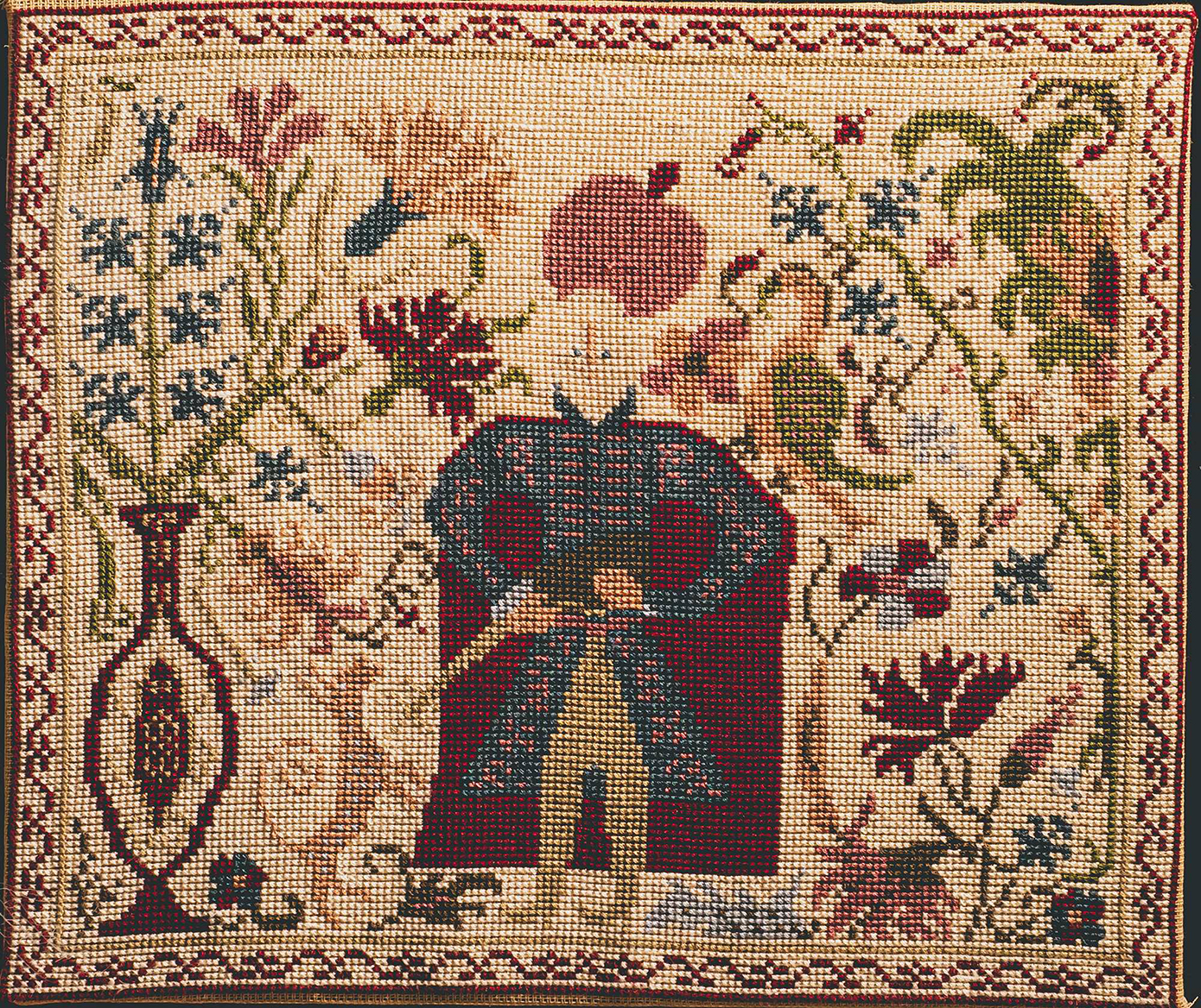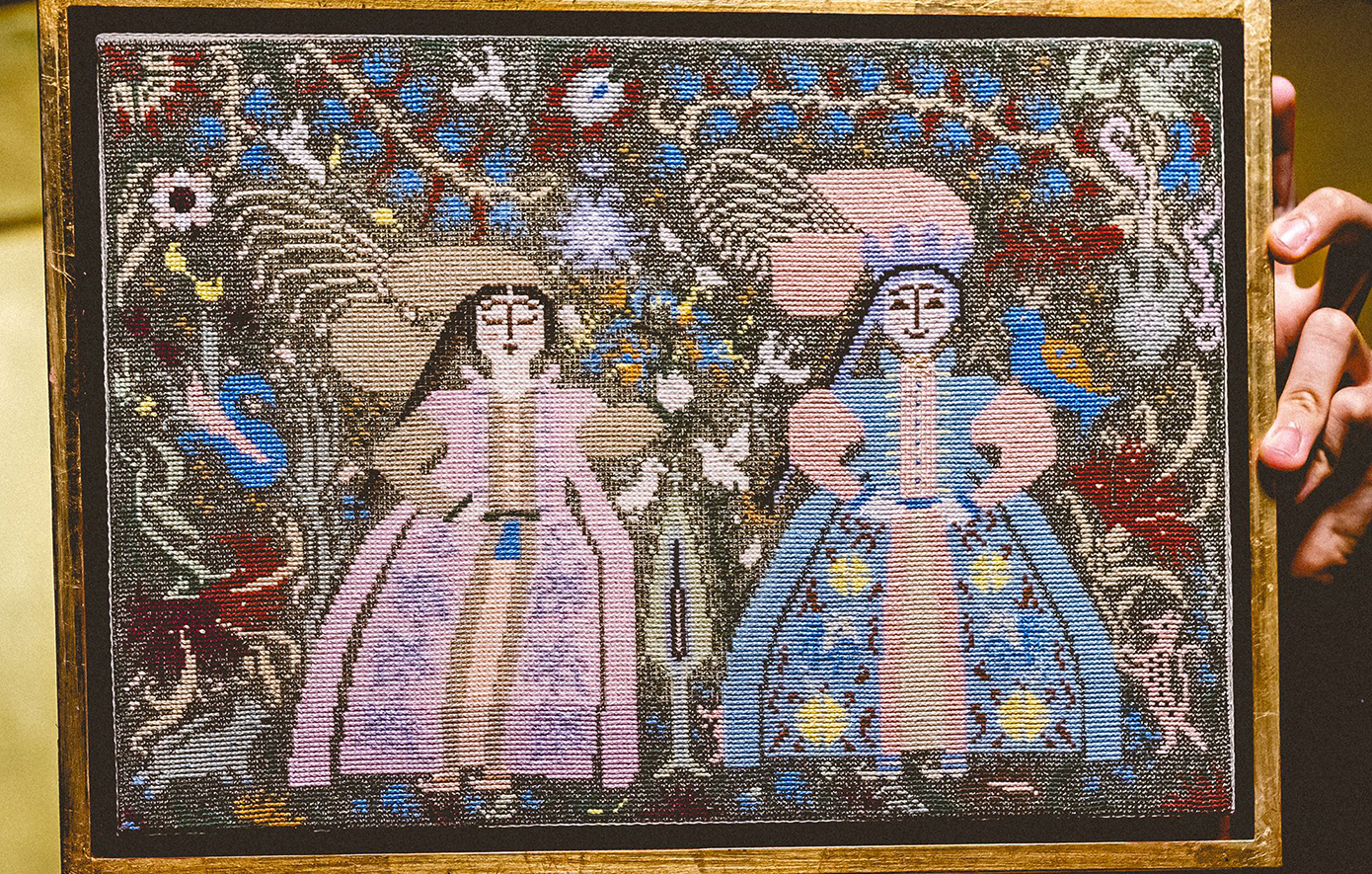Τα χρόνια πέρασαν και μπορεί το κέντημα ως χόμπι να μην είναι το ίδιο δημοφιλές με τότε, όμως, αρκετοί είναι εκείνοι που εξακολουθούν να κεντάνε. Η Διονυσία Παπαδοπούλου κεντά με πάθος αλλά και με απόλυτη συνείδηση της επιθυμίας και του προορισμού της βελόνας της, εδώ και περισσότερα από δέκα χρόνια. Ανθισμένοι κάμποι, πλοχμοί και πουλιά, πριγκίπισσες και έφιπποι, περίτεχνα φυτικά μοτίβα, σπείρες και ελλειπτικές φόρμες κεντημένες επίπονα με επιδέξια σταυροβελονιά και στιλπνά χρώματα, οργανώνουν περίτεχνα οπτικά πεδία και διασώζουν παλαιότερα αφηγήματα.