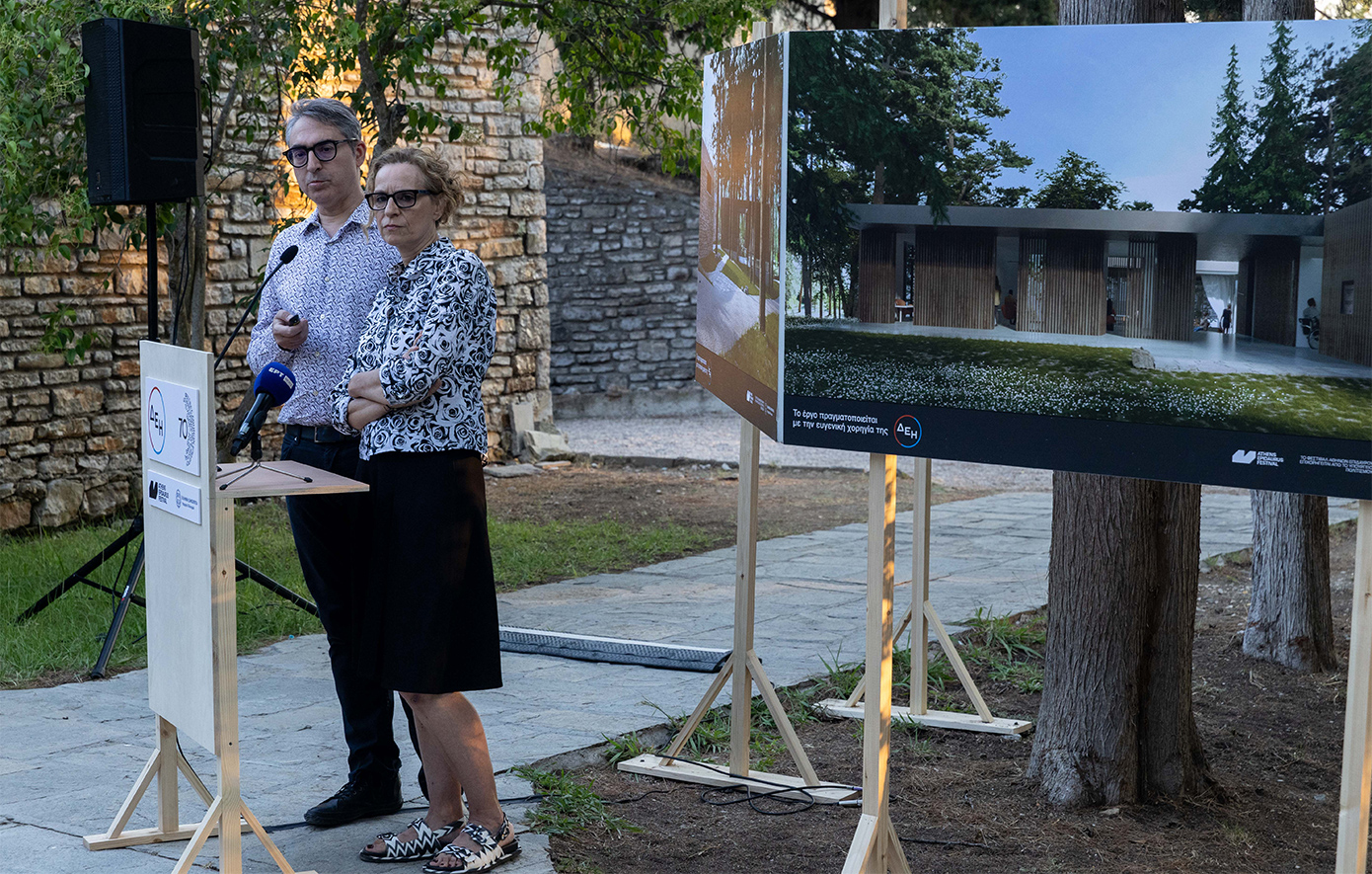 Η ανακοίνωση του έργου έγινε την Παρασκευή 18 Ιουλίου, κατά τη διάρκεια Συνέντευξης Τύπου που πραγματοποιήθηκε στον χώρο ανέγερσης του Pavilion, δίπλα στον εκθεσιακό χώρο της Αρχαίας Επιδαύρου. Παρουσία δημοσιογράφων και θεσμικών προσκεκλημένων, οι αρχιτέκτονες Εύα Μανιδάκη και Θανάσης Δεμίρης παρουσίασαν το αρχιτεκτονικό πλάνο του έργου, το οποίο αναπτύσσεται σε απόλυτη αρμονία με το τοπίο και με σεβασμό στη φυσιογνωμία του γειτονικού κτιρίου του σπουδαίου αρχιτέκτονα, Άρη Κωνσταντινίδη.