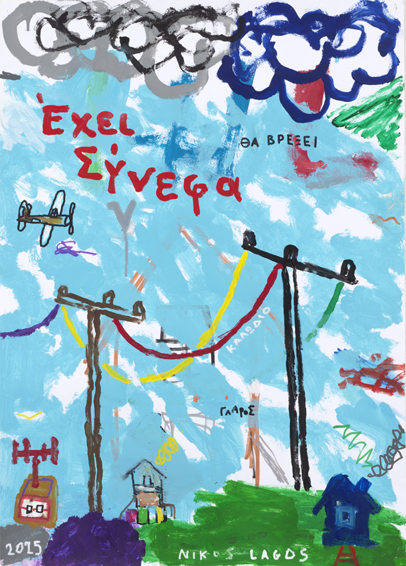 Όπως σημειώνει ο Χριστόφορος Μαρίνος στο κείμενό του για την έκθεση, «η ζωγραφική του Νίκου Λαγού κινείται σε πολλαπλές διαστάσεις χώρου και χρόνου, πέρα από τη λογική ερμηνεία». Σπίτια, καρδιές, σκάλες, κεραίες, σύννεφα, κρανία, σκελετοί και λέξεις –στα ελληνικά και στα αγγλικά– γεμίζουν τον ζωγραφικό χώρο, άλλοτε λειτουργώντας αυτόνομα και άλλοτε σχηματίζοντας ποιητικές ή αινιγματικές φράσεις. Αναφορές σε τραγούδια, επαναλαμβανόμενα μοτίβα και παιγνιώδεις δομές παραπέμπουν σε έναν κόσμο που μοιάζει να οικοδομείται και να αποδομείται ταυτόχρονα.