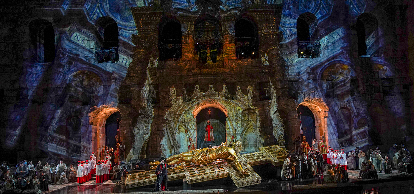 Η «Τόσκα» είναι η πρώτη μεγάλη καλοκαιρινή όπερα της Εθνικής Λυρικής Σκηνής στο Ωδείο Ηρώδου Αττικού για το 2024. Η παραγωγή που ανέβηκε για πρώτη φορά στο Ηρώδειο το 2012 αποτελεί ένα συναρπαστικό, δραματικό ανέβασμα, απολύτως συνεπές στο πνεύμα του συνθέτη, αλλά και στο ιστορικό πλαίσιο στο οποίο αναφέρεται το λιμπρέτο. Τα εντυπωσιακά σκηνικά, ένας τεράστιος σταυρός με τον εσταυρωμένο, μια ιερή τράπεζα, ένα εργαστήρι ζωγραφικής, πλαισιώνονται από θεαματικές προβολές μνημείων της Ρώμης, θρησκευτικών συμβόλων, αλλά και βίντεο που δίνουν μια κινηματογραφική διάσταση στην παραγωγή.