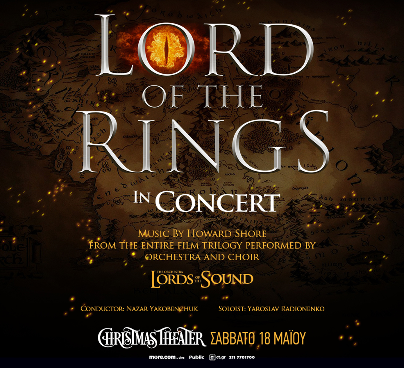 Με 80 μουσικούς και συνεργάτες κάθε συναυλία της ορχήστρας Lords of the Sound αποτυπώνεται αξέχαστα στο μυαλό και στην καρδιά των χιλιάδων θαυμαστών διάσημων ταινιών ανά των κόσμο! Η Συμφωνική Ορχήστρα, η οποία πραγματοποίησε 3 sold out συναυλίες στο Christmas Theater, επιστρέφει και παρουσιάζει τη νέα μουσική παράσταση «Lord of the Rings in Concert»!