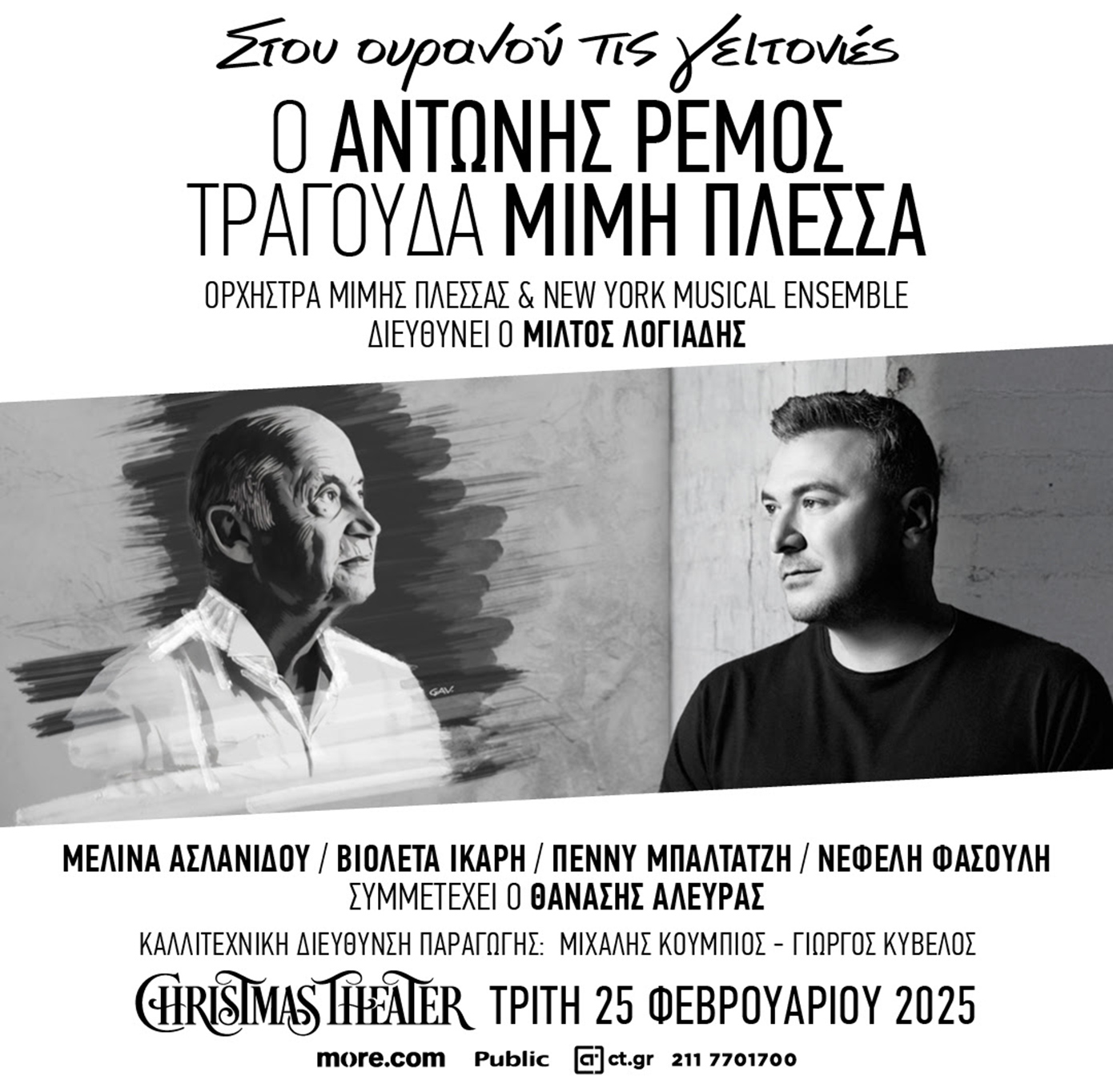 Ο Αντώνης Ρέμος έρχεται στις 25 Φεβρουαρίου 2025 στο Christmas Theater για να τραγουδήσει τον Μίμη Πλέσσα. Τον αγαπημένο του συνθέτη που είχε την τιμή να μοιραστεί πολλές φορές τη σκηνή μαζί του.