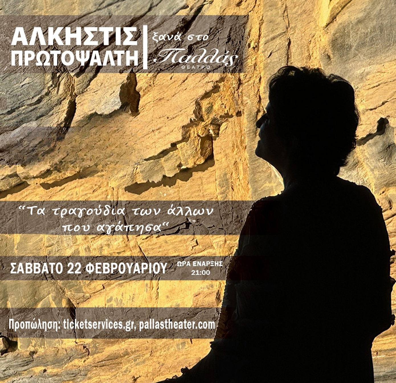 Η Άλκηστις Πρωτοψάλτη επιστρέφει με την επιτυχημένη παράσταση «Τα τραγούδια των άλλων που αγάπησα», ένα μουσικό αφιέρωμα σε τραγούδια που έχουν αγαπηθεί από το ευρύ κοινό από φωνές μεγάλων καλλιτεχνών.