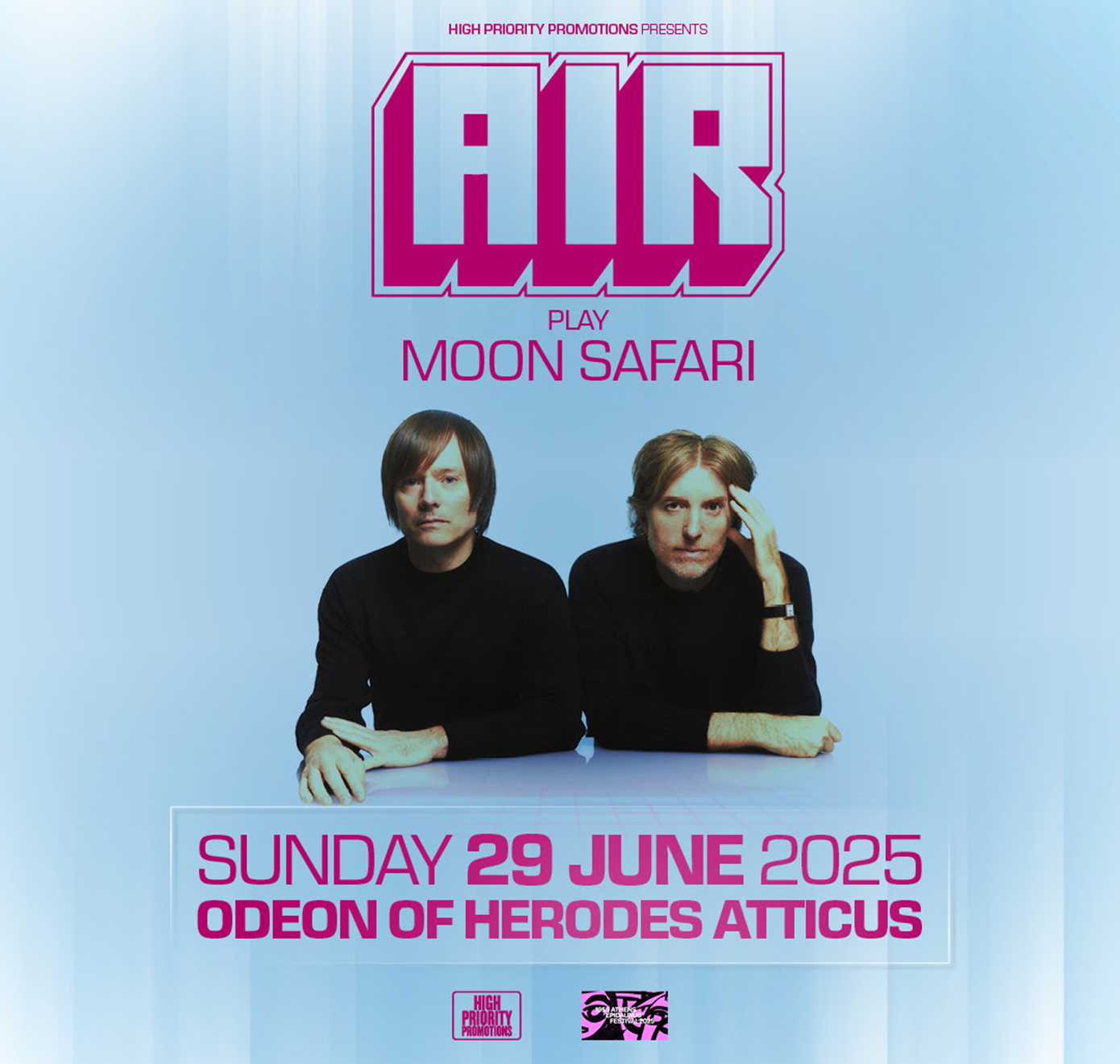 Το 2024, οι Air παρουσίασαν το Moon Safari ζωντανά στο σύνολό του για πρώτη φορά. Με αυτό το αριστούργημα στο ρεπερτόριό τους, θα μας επισκεφθούν για να προσφέρουν μια αξέχαστη συναυλία στο μαγευτικό Ωδείο Ηρώδου του Αττικού την Κυριακή, 29 Ιουνίου 2025 στο πλαίσιο του Φεστιβάλ Αθηνών Επιδαύρου.
