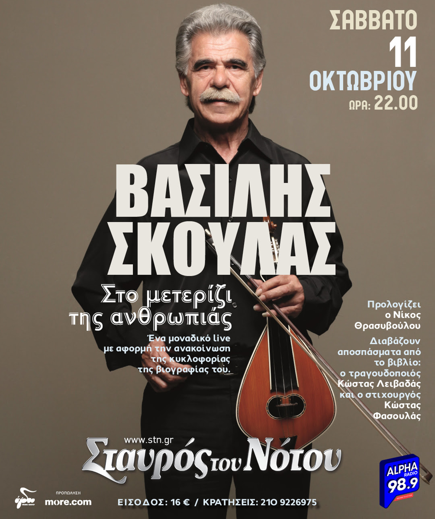 Ο πιο αγαπητός πρεσβευτής της κρητικής παράδοσης, ο Βασίλης Σκουλας έρχεται για μία και μοναδική εμφάνιση στο Σταυρό του νότου Plus, με αφορμή την ανακοίνωση της κυκλοφορίας της βιογραφίας του «Στο μετερίζι της ανθρωπιάς» για ένα live που πρόκειται να συγκινήσει.