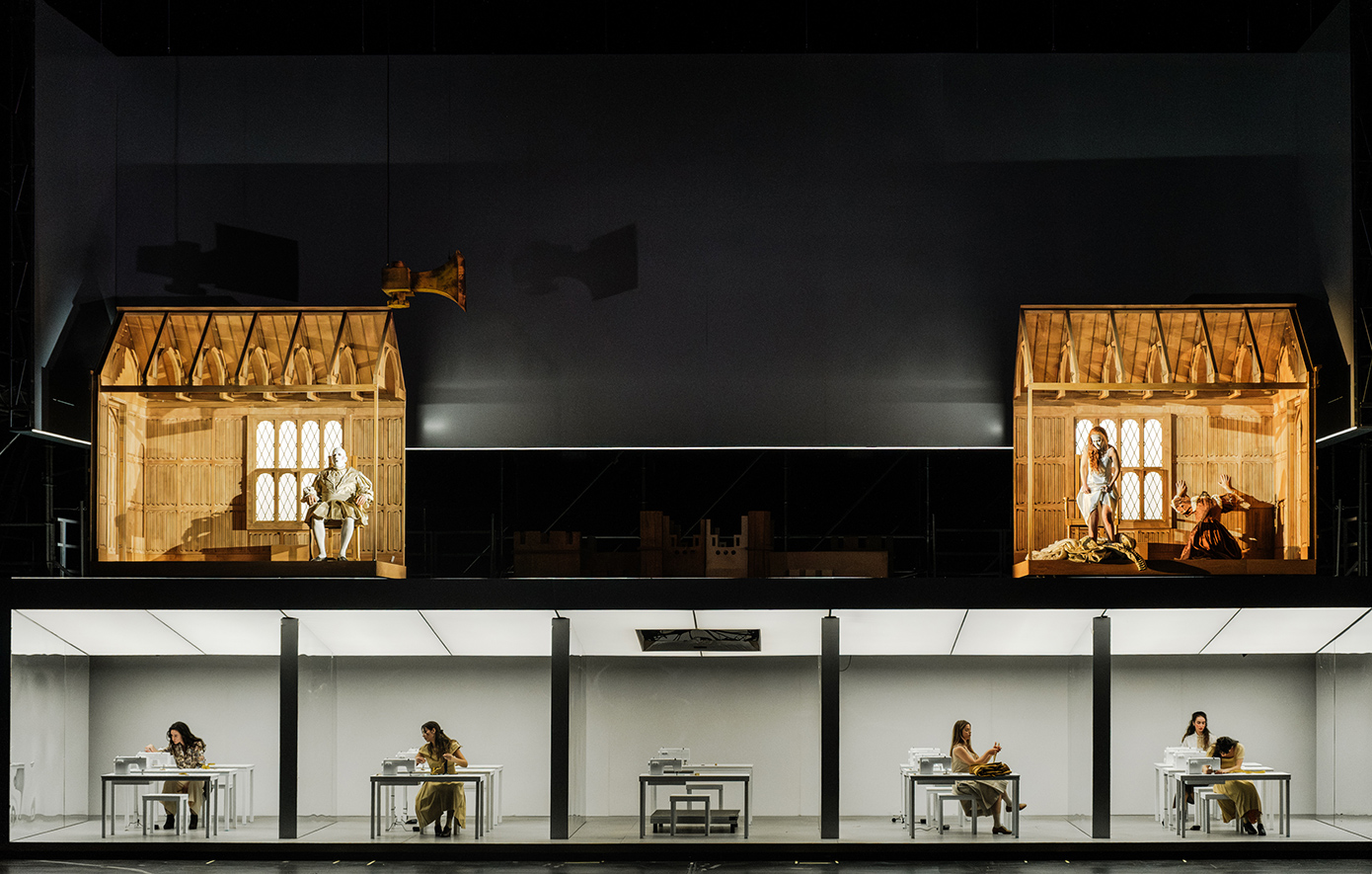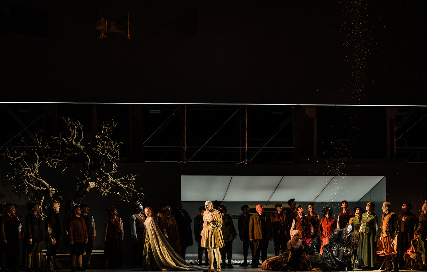 Το σκηνικό οργανώνεται ως αρχειακό οικοσύστημα, όπου η Α΄ Πράξη ισορροπεί ανάμεσα στην επίκληση της ιστορικής πιστότητας και την αποκάλυψη της ιστορίας ως αντιγράφου, ενώ στη Β΄ Πράξη ο χώρος μετατρέπεται σε μουσείο, όπου αντικείμενα και πρόσωπα εκτίθενται ως τεκμήρια μιας παγιωμένης αφήγησης. Παράλληλα, το ηχητικό περιβάλλον που δημιουργείται για την παράσταση λειτουργεί ως αρχειακή παρέμβαση που διακόπτει την αυτάρκεια του μπελ κάντο, φέρνοντας στο προσκήνιο τη βία που το έργο έχει αισθητικοποιήσει. Ιδιαίτερη έμφαση δίνεται στη σκηνή της τρέλας, όπου η φωνητική ακρότητα εκτίθεται ως θέαμα και η γυναικεία φωνή ως πεδίο φετιχοποίησης. «Η ιστορία δεν είναι ένα κλειστό αφήγημα προς αναπαράσταση, αλλά ένας ζωντανός μηχανισμός που μας διαμορφώνει», επισημαίνει ο σκηνοθέτης, προτείνοντας μια παράσταση που δεν αναπαριστά απλώς το παρελθόν, αλλά δοκιμάζει τα όρια της δικής μας σχέσης μαζί του.