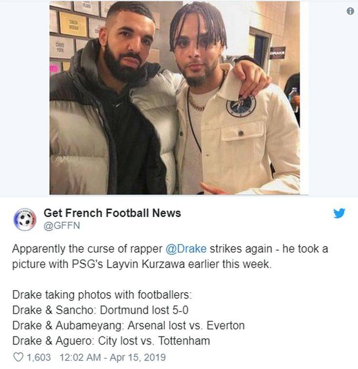 Ο Drake φαίνεται ότι φέρνει κακοτυχία στις ομάδες, κάθε φορά που παίκτης του βγαίνει φωτογραφία μαζί του. Τελευταίο «θύμα» του Καναδού ήταν η Παρί Σεν Ζερμέν, η οποία γνώρισε διασυρμό από τη Λιλ (ήττα με 5-1), στο πρόσφατο παιχνίδι των δύο ομάδων για τη Ligue 1. Αποτέλεσμα που ήρθε μετά από μια φωτογραφία που έβγαλε με τον Λαϊβίν Κουρζαβά.