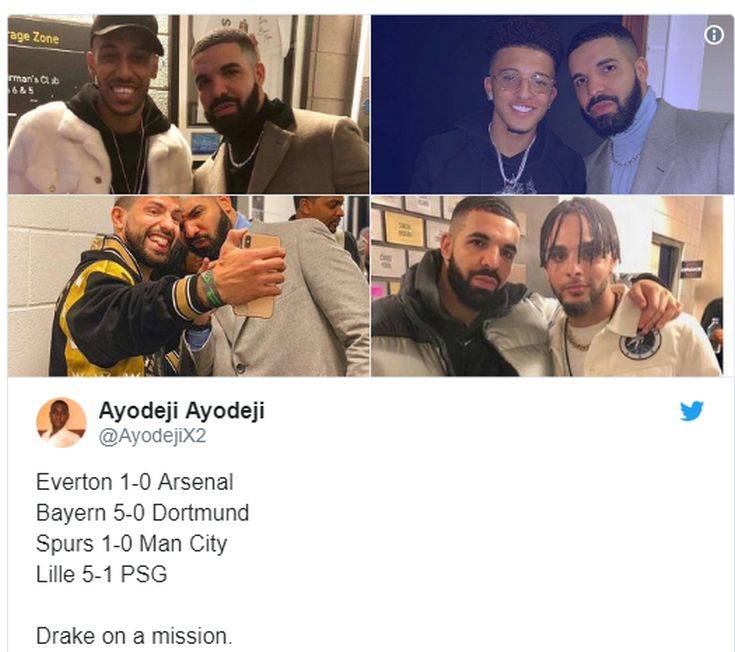 Ο Drake είχε μεταφέρει τα… vibes του και στην Μπορούσια Ντόρτμουντ, όταν είχε φωτογραφηθεί με τον Τζάντον Σάντσο, πριν από τη συντριβή με 5-0 από την Μπάγερν Μονάχου, αλλά και στη Μάντσεστερ Σίτι, όταν είχε βγει σέλφι με τον Σέρχιο Αγουέρο στα πλαίσια του παιχνιδιού με την Τότεναμ για τα προημιτελικά του Champions League. Τα «σπιρούνια» είχαν επιβληθεί σε αυτό το παιχνίδι με 1-0. Μην λησμονήσουμε και την Άρσεναλ, που έχασε από την Έβερτον με 1-0 από την Έβερτον, έπειτα από το «κλικ» με τον Πιέρ Εμερίκ Ομπαμεγιάνγκ.