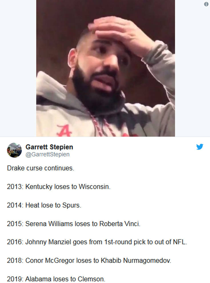 Η «κατάρα» του Καναδού ράπερ επεκτείνεται και στην άλλη άκρη του Ατλαντικού. Σύμφωνα με το γνωστό… γλέντι που έγινε στο Twitter, «εξαιτίας» του 33χρονου καλλιτέχνη έχασαν το 2013 το Κεντάκι από το Ουισκόνσιν, το 2014 οι Μαϊάμι Χιτ από τους Σαν Αντόνιο Σπερς, το 2015 η Σερένα Ουίλιαμς από το μεγάλο αουτσάιντερ Ρομπέρτα Βίντσι, το 2018 ο Κόνορ ΜακΓκρέγκορ και μέσα στη φετινή χρονιά η Αλαμπάμα από το Κλέμσον.