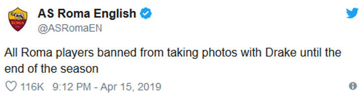 Την… παράδοση αυτή που δημιούργησε ο Drake την αντιλήφθηκαν στη Ρόμα, οι άνθρωποι της οποίας επέβαλαν «εμπάργκο» στους παίκτες της ομάδας να μην φωτογραφηθούν μαζί του.