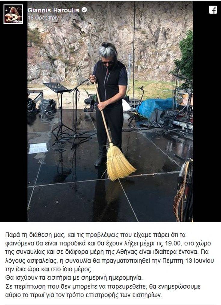 Ο τραγουδοποιός ανέβασε χθες στο Facebook ένα ποστ που τον δείχνει να σκουπίζει τα νερά και να ενημερώνει για τη νέα συναυλία και το τι θα ισχύσει με τα εισιτήρια.