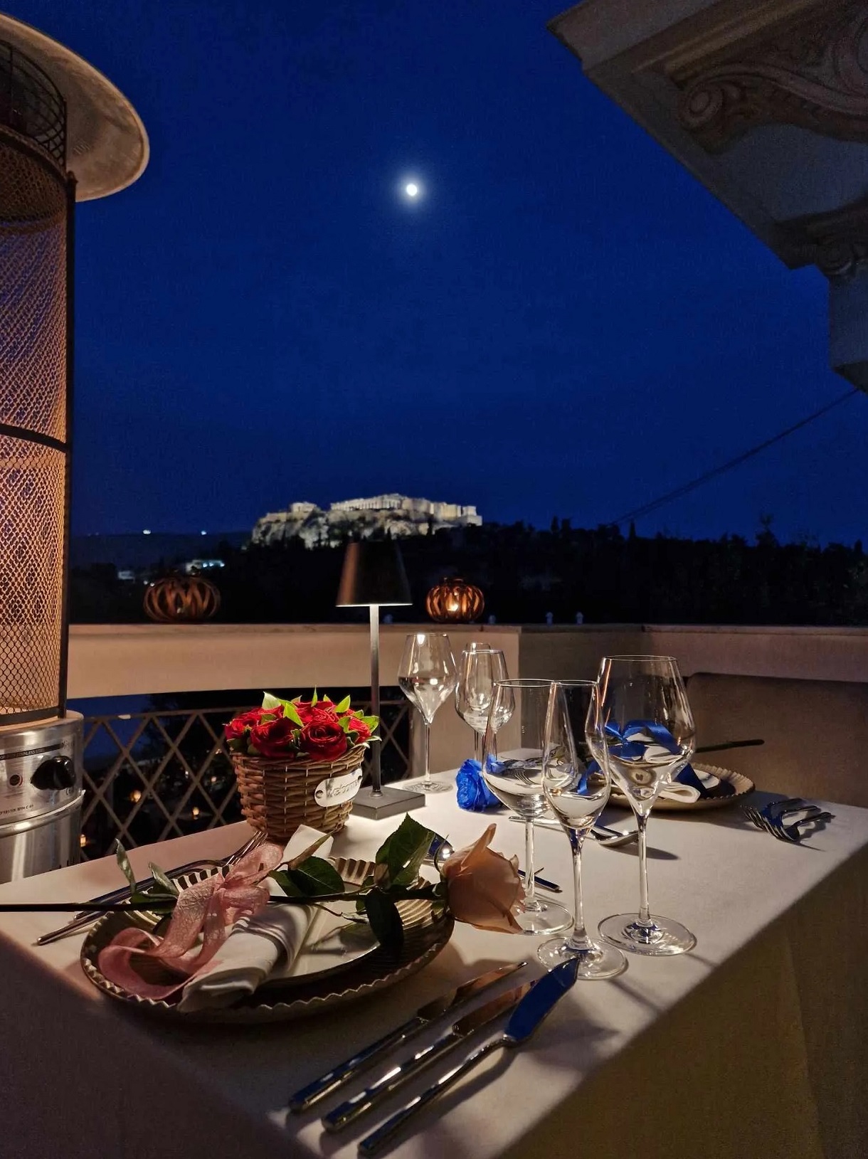 Το βράδυ το σκηνικό αλλάζει, με την ατμόσφαιρα να γίνεται πραγματικά μαγική και το μενού να αποτελεί, κατά κάποιον τρόπο, προέκταση του μεγαλείου που απλώνεται μπροστά στα μάτια του επισκέπτη. Ο φωταγωγημένος βράχος της Ακρόπολης σε gros plan μετατρέπει το όλο περιβάλλον σε καρτποσταλικό. Μόνο που είναι 100% αληθινό!