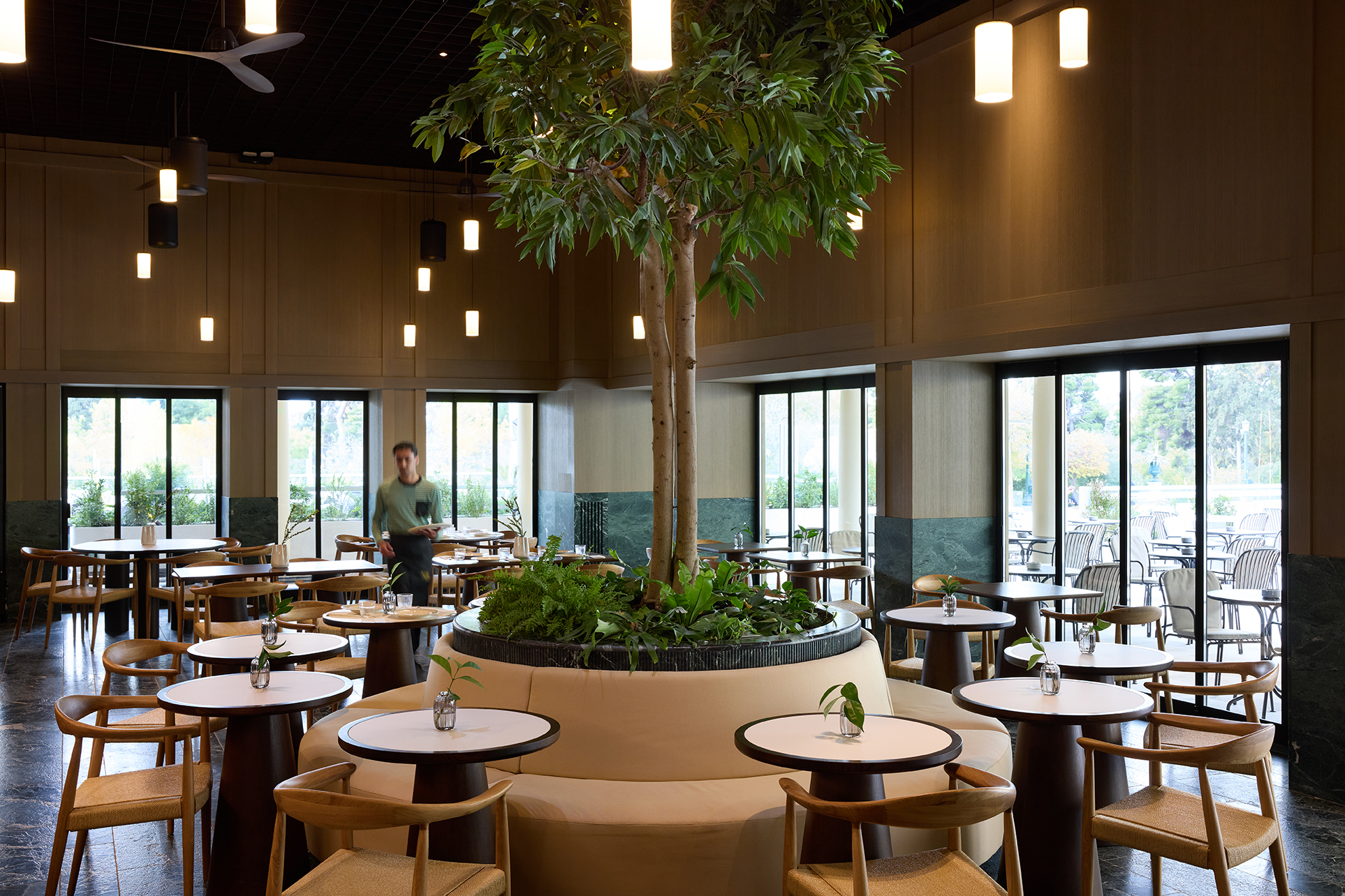 Η πραγματική μαγεία όμως έγκειται στο γεγονός ότι, μέσα από τεράστιες γυάλινες επιφάνειες, οι επισκέπτες απολαμβάνουν μια συγκλονιστική θέα στους ιστορικούς κήπους του Ζαππείου – μια οπτική εμπειρία που δημιουργεί την ψευδαίσθηση ότι βρίσκεται κανείς ταυτόχρονα στο κέντρο της Αθήνας και έξω από αυτό, σε έναν παράλληλο κόσμο αρμονίας.