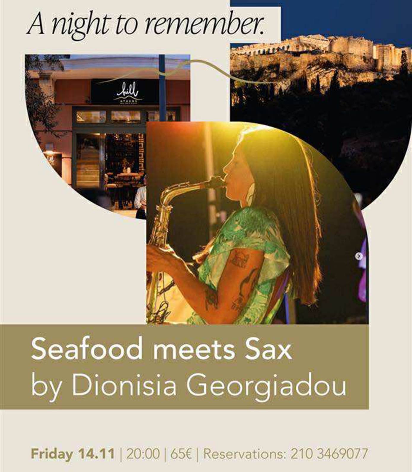 Μάλιστα, συχνά τους επισκέπτες του Hill Athens περιμένουν διάφορες εκπλήξεις και happenings, για αξέχαστες γαστρονομικές εμπειρίες. Έτσι, την Παρασκευή 14 Νοεμβρίου στις 20:00 σας περιμένει το «sea food flavors», όπου θα παρουσιαστούν γεύσεις από τη θάλασσα, υπό την επιμέλεια των σεφ του εστιατορίου, Δημήτρη Δημητριάδη και Κωνσταντίνο Μπρίνια. Τη βραδιά συνοδεύει η εξαιρετική Διονυσία Γεωργιάδου με το σαξόφωνο της.