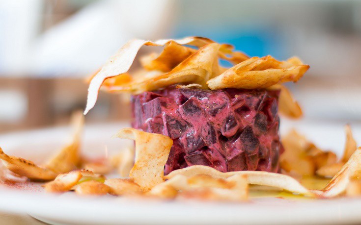 Πατζαροσαλάτα με αμύγδαλα και κορδέλες από αραβική πίτα
