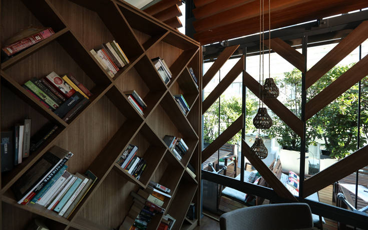 Στα πλάγια, οι αναπαυτικοί καναπέδες προσφέρονται εξαιρετικά για επαγγελματικά και άλλα ραντεβού, καθώς και για φαγητό, καφέ και ποτό. Κοντά στο μπαρ δημιουργήθηκε μια όμορφη γωνιακή βιβλιοθήκη, για εκείνους που αποζητούν περισσότερη ηρεμία για να δουλέψουν ή να χαλαρώσουνσε ιδιαίτερα αναπαυτικές lounge πολυθρόνες.