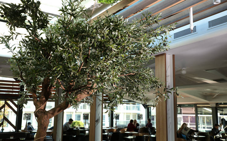 Τα διαφορετικά έπιπλα και η νέα διακόσμηση δημιουργούν ξεχωριστές γωνιές, δίδοντας την αίσθηση μεμονωμένων χώρων. Στα καθιστικά της ελιάς, γύρω από το μεγάλο δέντρο, το σκηνικό είναι ζεστό και ταυτόχρονα προσεγμένο, ιδανικό για παρέες που θέλουν να απολαύσουν το φαγητό τους όλες τις ώρες.