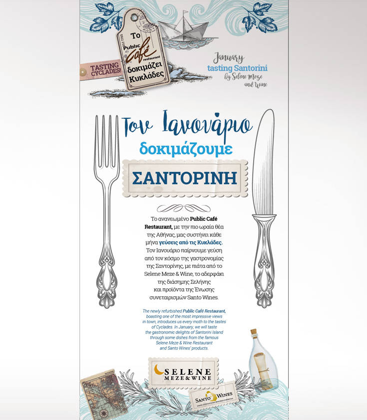 Αέρας Σαντορίνης στην πλατεία Συντάγματος! Το Public Café Restaurant, το στέκι με την καλύτερη θέα της Αθήνας, πλήρως ανανεωμένο, μας συστήνει κάθε μήνα γεύσεις από τις Κυκλάδες.