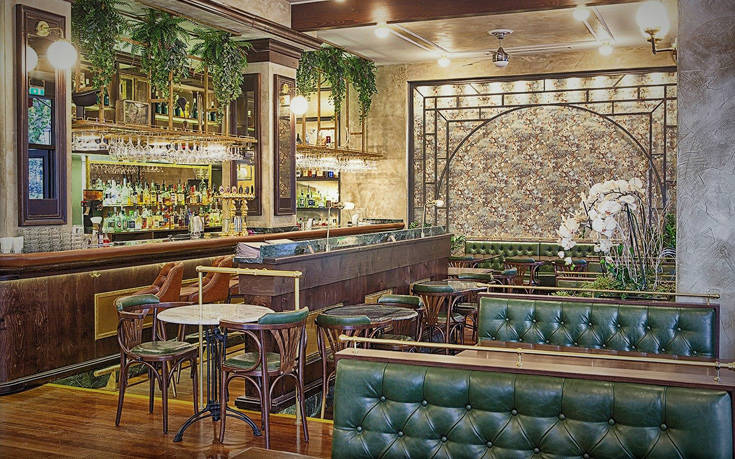 Έντονο το στοιχείο του ξύλου, δερμάτινοι καναπέδες, πράσινα μαρμάρινα τραπέζια, όμορφες ταπετσαρίες, ατμοσφαιρικός φωτισμός, μεγάλες τζαμαρίες και μια επιβλητική μαρμάρινη μπάρα με δερμάτινα τελειώματα, ταξιδεύουν στο χρόνο, σε παλιά, κλασικά και διαχρονικά στέκια της πόλης.