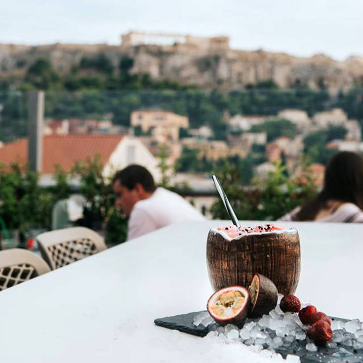 Στα αδιαμφισβήτητα δυνατά «χαρτιά» του, που μας κάνουν να το επιλέγουμε ξανά και ξανά, η εκπληκτική open air ταράτσα του, απ’ όπου η θέα στην Ακρόπολη είναι απρόσκοπτη και μαγευτική. Λειτουργεί όλο το χρόνο, πάντα καιρού επιτρέποντος, ενώ στα συν του συγκαταλέγεται το μπαλκόνι περιμετρικά του εσωτερικού του χώρου.