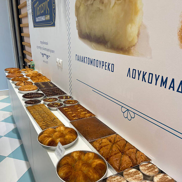 Στην κορυφή όλων, ωστόσο, στέκεται ο «σταρ» γαλακτομπούρεκο που προσφέρεται ολόφρεσκο και ζεστό, ενώ το ακολουθούν το εξαιρετικό εκμέκ, το μιλφέιγ και τα τρίγωνα πανοράματος, καθώς και τσουρέκια με διάφορες επικαλύψεις. Τέλος, οι λουκουμάδες σερβίρονται και εδώ, με την διαφορά ότι το κατάστημα λειτουργεί μόνο για γλυκό στο χέρι ή πακέτο.
