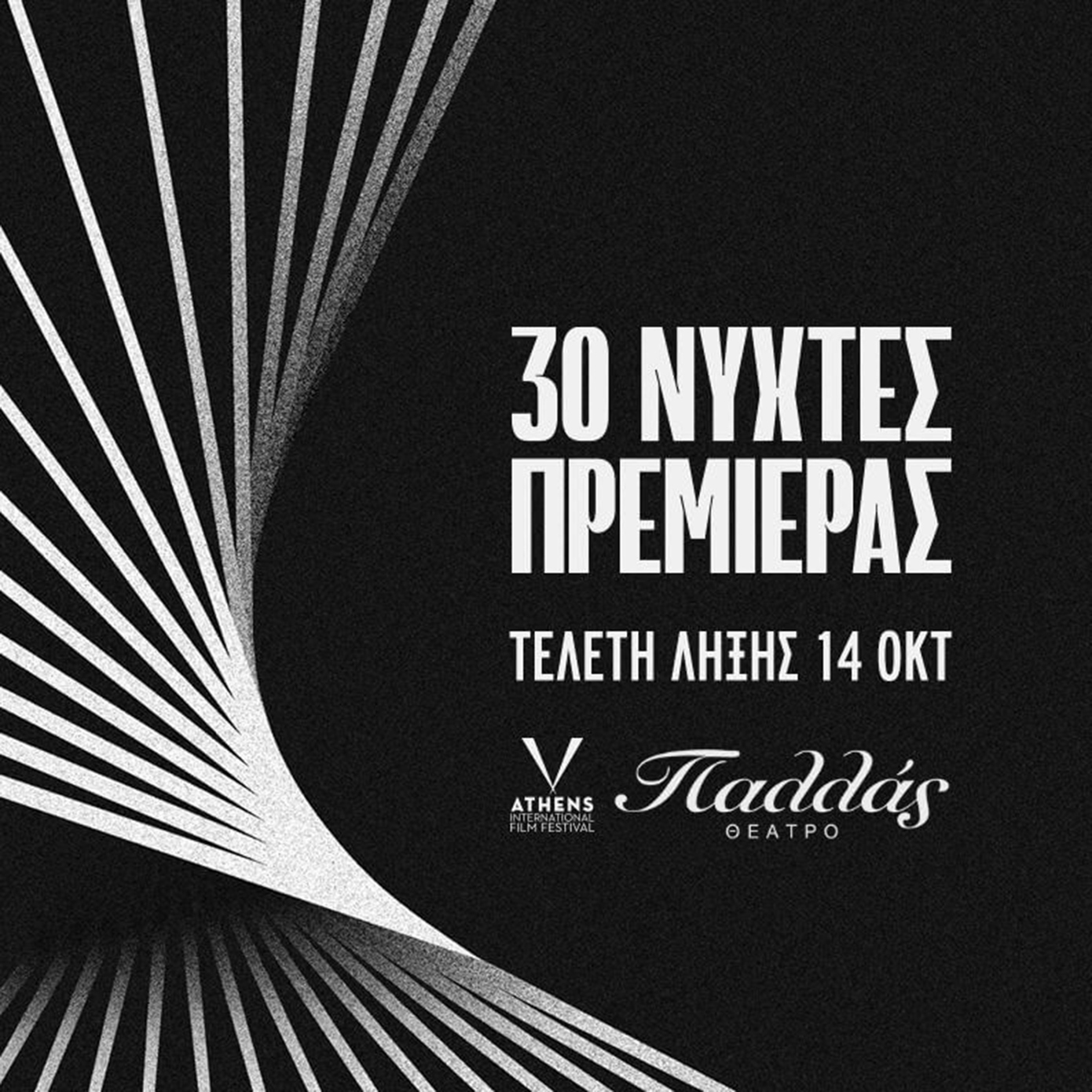 Το Θέατρο Παλλάς παρουσιάζει την τελετή λήξης του «30ου Διεθνές Φεστιβάλ Κινηματογράφου της Αθήνας Νύχτες Πρεμιέρας», στις 14 Οκτωβρίου με την πανελλήνια πρεμιέρα ενός εκ των κινηματογραφικών γεγονότων της φετινής χρονιάς, το «Room next door» του Πέδρο Αλμοδοβάρ και την «Τελετή Λήξης και την Απονομή των Βραβείων» του Φεστιβάλ.