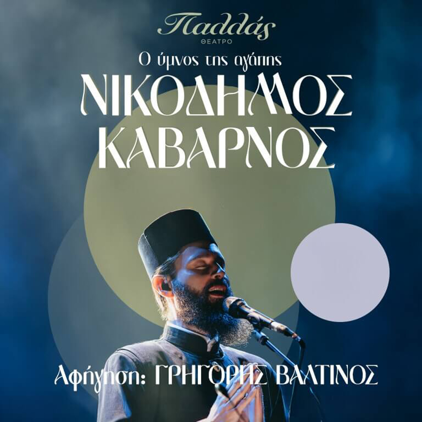 Ο διεθνώς αναγνωρισμένος αοιδός και βραβευμένος από την UNESCO για τη προσφορά του στη μουσική, Νικόδημος Καβαρνός, εμφανίζεται, για πρώτη φορά στο Θέατρο Παλλάς. Στις 10 Δεκεμβρίου, οι θεατές θα έχουν την ευκαιρία να παραστούν σ’ ένα μοναδικό καλλιτεχνικό γεγονός, μια παράσταση γεμάτη ουράνιες ψαλμωδίες, υπό την συνοδεία της πολυμελούς Βυζαντινής Χορωδίας καθώς και της Αθηναϊκής Ορχήστρας Σύγχρονης Μουσικής. Αφηγείται ο Γρηγόρης Βαλτινός.