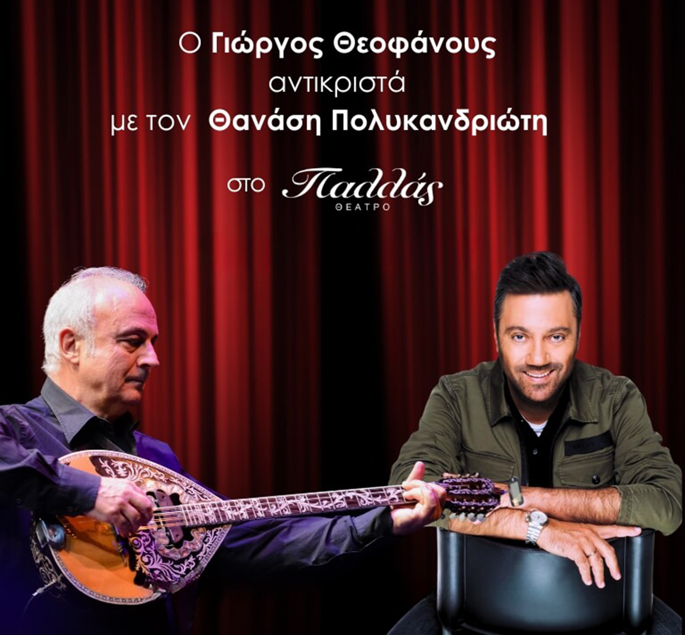 Ο Γιώργος Θεοφάνους συναντά επί σκηνής τον Θανάση Πολυκανδριώτη και αντικριστά έρχονται στις 14 Ιανουαρίου, για να μας ταξιδέψουν στον κόσμο των μελωδιών, των συναισθημάτων και των τραγουδιών που έχουν σφραγίσει τις στιγμές και τις μνήμες μας. Με συνοδοιπόρους τον Άκη Δείξιμο την Όλγα Βενετσιάνου, τον Νίκος Παπουτσή τον Προκόπη Πολίτη (Paco), την Σοφία Παπουλάκου και μια ορχήστρα καταξιωμένων μουσικών, μας συνεπαίρνουν σ’ ένα μουσικό ταξίδι στον χρόνο, γεμάτο αγαπημένες μελωδίες.