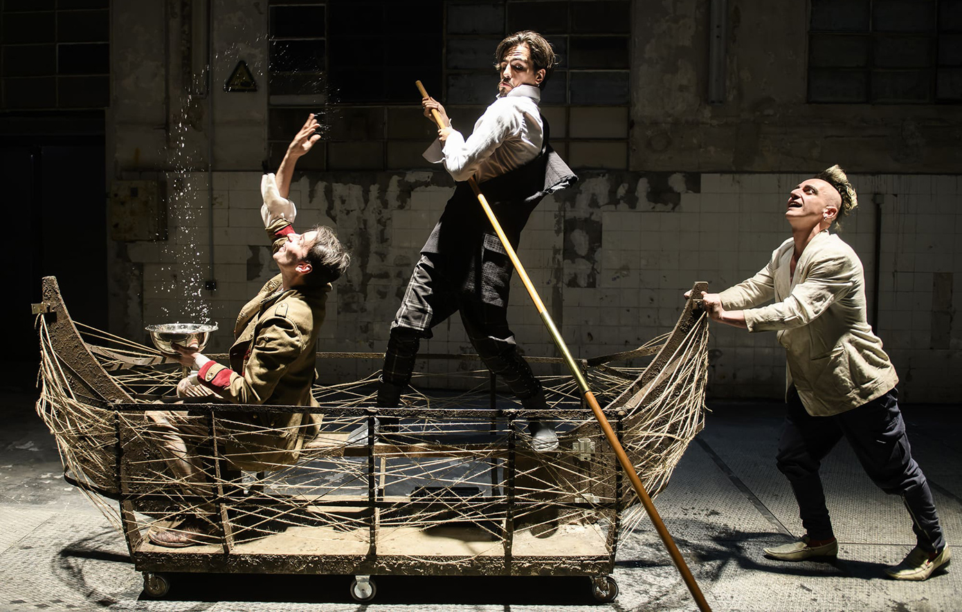Στην καθηλωτική μεταφορά που παρουσιάζεται στο Τεχνοχώρο Cartel, ο πολυσύνθετος κόσμος του Αντόνιο, του Μπασίανο, της Πόρσια, του Σάιλοκ και των υπόλοιπων σαιξπηρικών ηρώων τοποθετείται σε μια Βενετία μεταβιομηχανική και δυστοπική, χωρίς νερό, με άδεια κανάλια. Μια Βενετία μέσα σε ένα άδειο εργοστάσιο, μια πόλη που δεν υπάρχει πια και όπου όλα μπορούν να συμβούν….