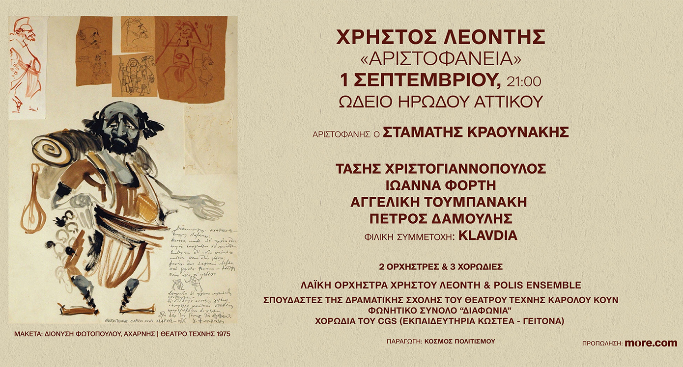 Ο Χρήστος Λεοντής μάς καλεί τον Σεπτέμβριο στο Ηρώδειο για να υποδεχτούμε όλοι μαζί, τον παλιό και πολυαγαπημένο φίλο του Αριστοφάνη, για να συμμετέχει στο μεγάλο λαϊκό πανηγύρι που θα παρουσιάσει και θα διευθύνει ο συνθέτης με τίτλο, «Αριστοφάνεια».