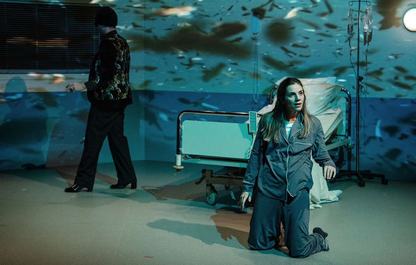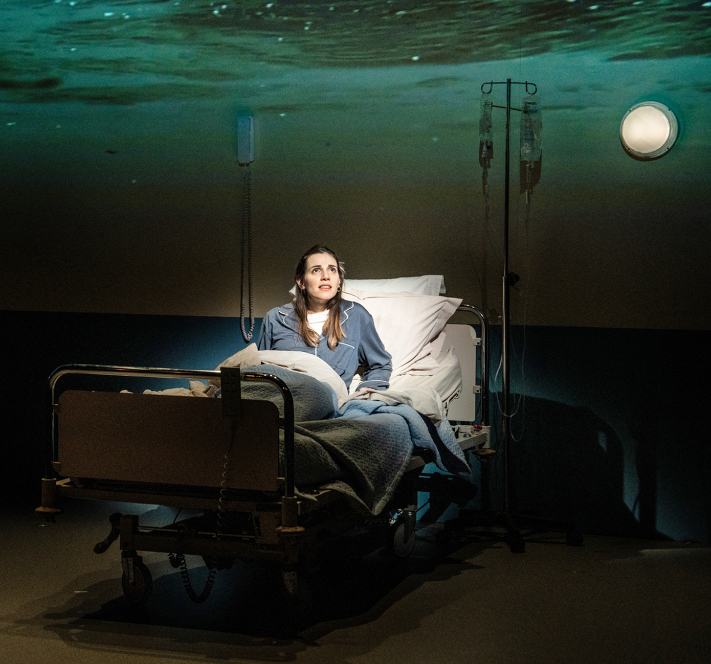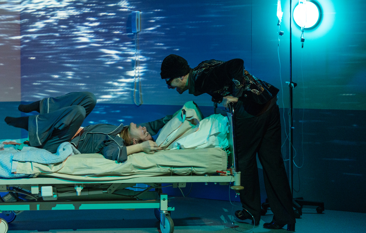 Η σκηνική δράση συνδυάζει ρεαλισμό και φαντασία: το video mapping μεταμορφώνει το νοσοκομειακό σκηνικό σε υδάτινη άβυσσο, όπου πραγματικότητα και όνειρο διαπλέκονται.