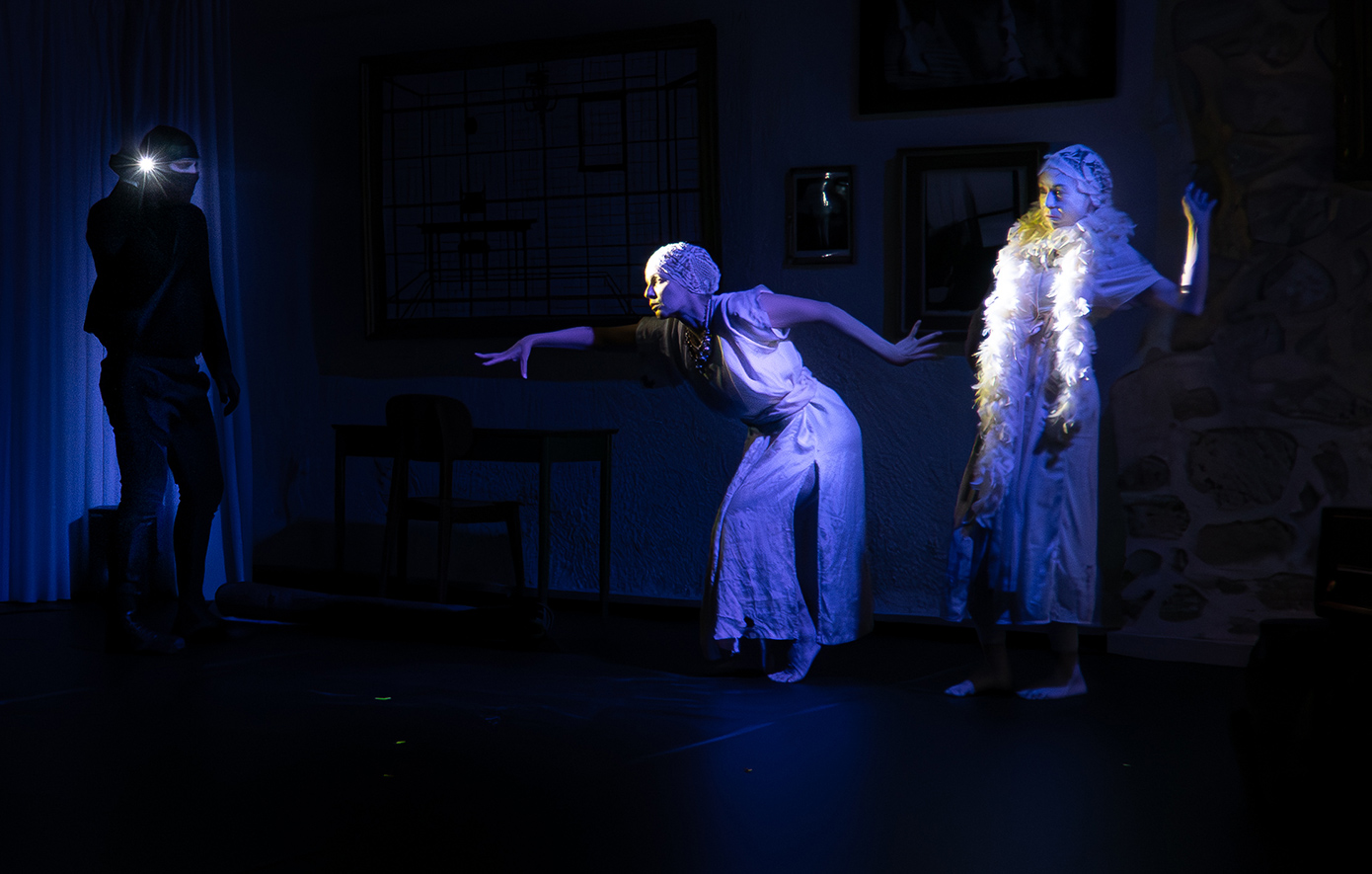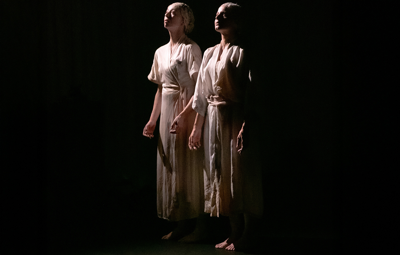 Α.Γ.: Τα Viewpoints μάς βοηθούν να συνθέσουμε τη σχέση ανάμεσα στα σώματα, στον χώρο και στον χρόνο. Ορίζουν τη ρυθμική και συνθετική δομή του έργου, ενώ το Butoh ανοίγει την εσωτερική του διάσταση. Μέσα από αυτά, εμείς οι δύο, η Kiki και η Colette, συναντιόμαστε, απομακρυνόμαστε, συνυπάρχουμε – σαν πνοές που μοιράζονται τον ίδιο αέρα.