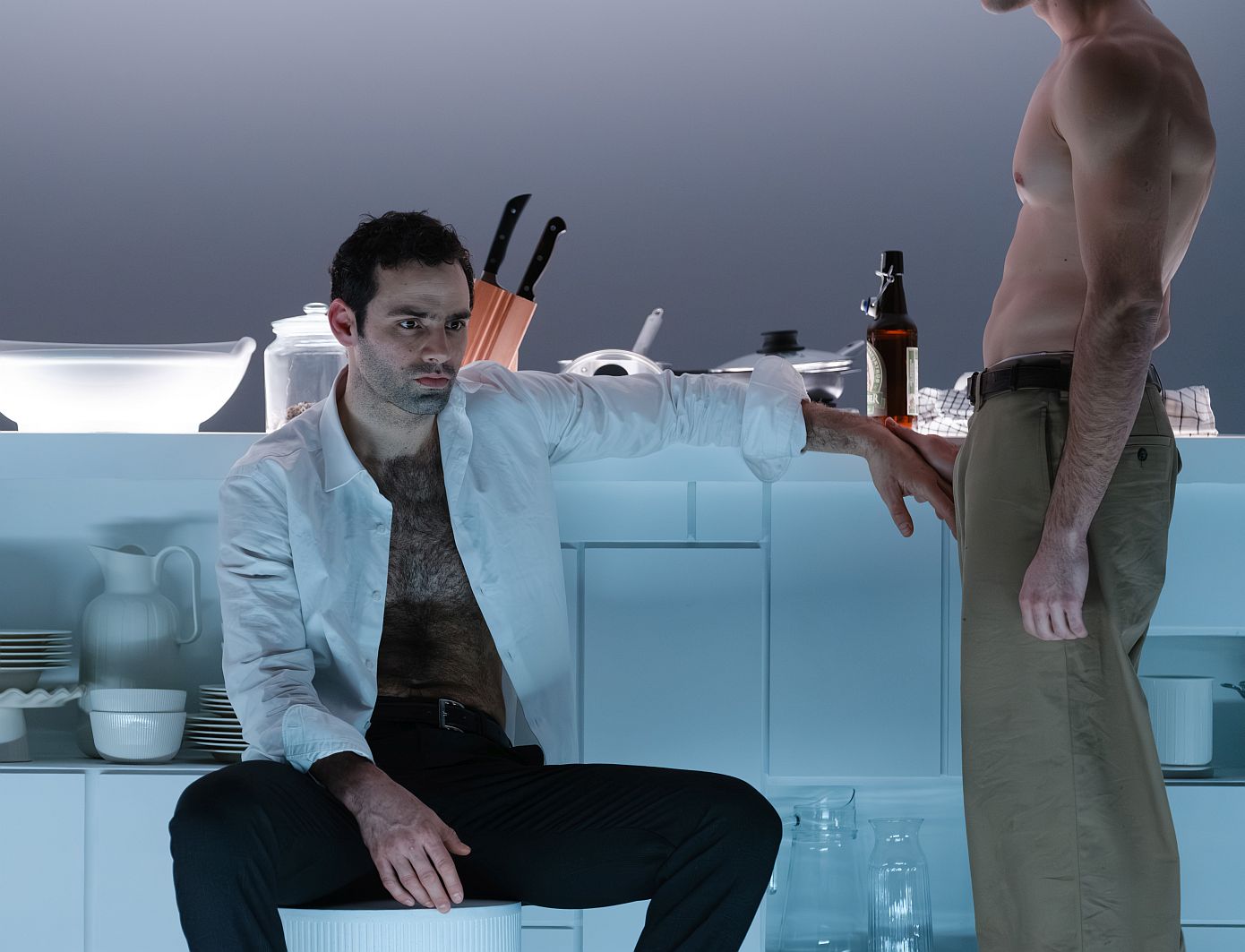 Η ένταση ανάμεσα στους δύο άνδρες είναι σωματική, ψυχική αλλά και βαθιά πολιτική. Δεν αφορά μόνο το ποιος επιθυμεί ποιον, αλλά το ποιος έχει το δικαίωμα να επιθυμεί, ποιος μπορεί να εκτεθεί και ποιος τελικά θα επιβιώσει. Η εξουσία δεν ασκείται μονομερώς: μετακινείται διαρκώς, αλλάζει χέρια, γίνεται πότε παιχνίδι και πότε απειλή. Η επιθυμία, η έλξη και ο ανταγωνισμός δεν αντιμετωπίζονται ως ιδιωτικά συναισθήματα, αλλά ως μηχανισμοί κυριαρχίας, δοκιμασίας και επιβολής.