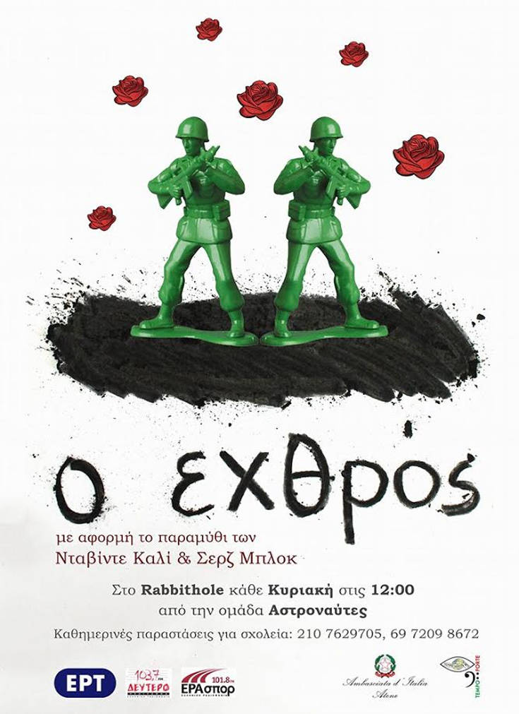 Από τις 4 Νοεμβρίου και κάθε Κυριακή στις 12 το μεσημέρι στο θέατρο Rabbithole, η ομάδα Αστροναύτες παρουσιάζει τη νέα της παραγωγή με τίτλο «Ο Εχθρός», μία παράσταση παντομίμας και βωβού κινηματογράφου, που βασίζεται στο ομώνυμο αριστούργημα των Ντάβιντε Καλί και Σερζ Μπλοκ.