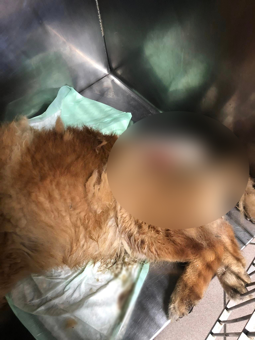 Από την εξέταση διαπιστώθηκε ότι ήταν ένα τεράστιο έγκαυμα που προκλήθηκε από καυστικό υγρό. Το ζώο χρειάζεται αλλαγές και κτηνιατρική παρακολούθηση μέχρι να επουλωθεί η πληγή του. Είναι αρνητικό σε καλαζάρ, οι αιματολογικές και βιοχημικές εξετάσεις του είναι πολύ καλές, είναι αστείρωτο αρσενικό, χωρίς τσιπ, περίπου 5 ετών.