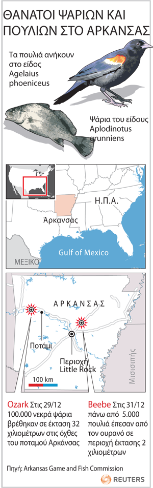 Οι αρχές της πολιτείας του Άρκανσας υποπτεύονται ότι για το θάνατο των 100.000 ψαριών που εντοπίστηκαν να επιπλέουν νεκρά στον ποταμό Arkansas River κοντά στην περιοχή Ozark ευθύνεται κάποια ασθένεια και δεν αποκλείουν το γεγονός η ίδια ασθένεια να οδήγησε στο θάνατο και περισσότερα από 5.000 πουλιά που από την παραμονή της Πρωτοχρονιάς πέφτουν νεκρά από τον ουρανό.