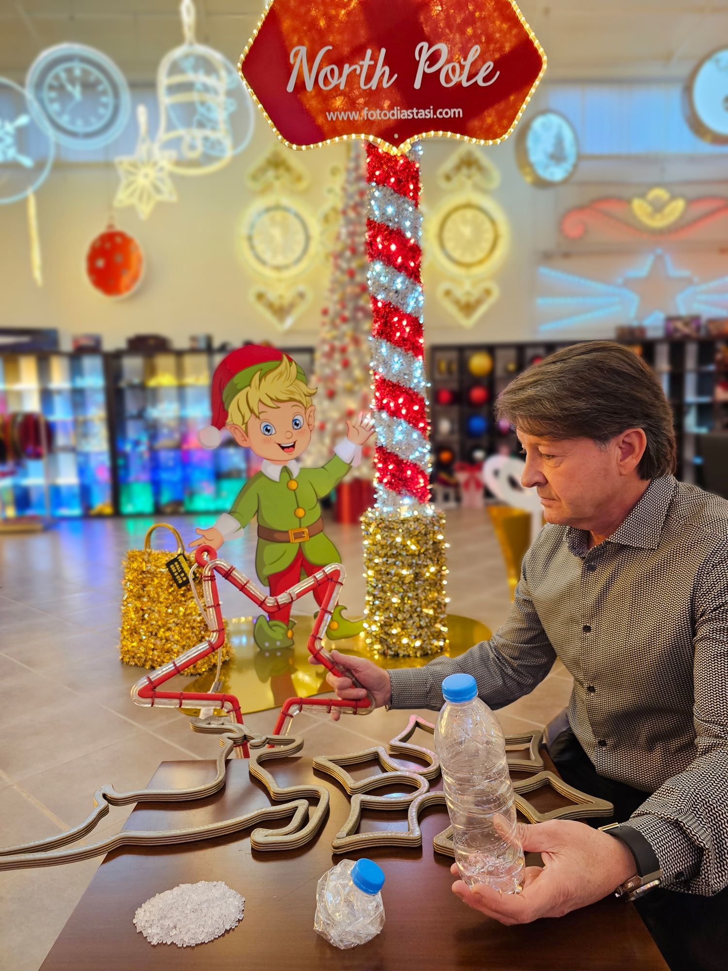 «Προχωρήσαμε σε μια πολύ καινοτόμα διαδικασία. Από την περισυλλογή των πλαστικών μπουκαλιών και των διχτυών από τη θάλασσα παίρνουμε την πρώτη ύλη. Την οδηγούμε στα μηχανήματά μας και εκεί (με το ανακυκλωμένο υλικό) κατασκευάζουμε αστέρια, καμπανούλες και κάθε είδους σχέδιο που βλέπετε στο διάκοσμο να κρέμεται στους δρόμους. Ένας διάκοσμος που προέρχεται από πεταμένα υλικά που έχουν καταλήξει στο βυθό της θάλασσας», λέει χαρακτηριστικά.