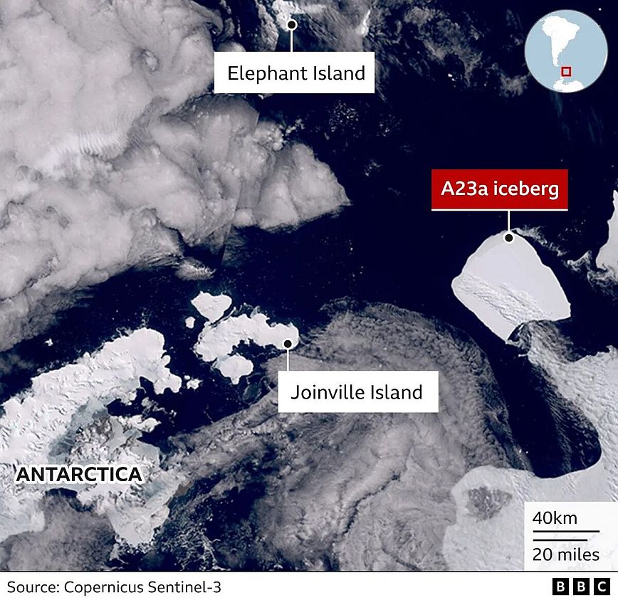 Σύμφωνα με το Reuters το παγόβουνο που ονομάζεται A23a εκτείνεται σε σχεδόν 4.000 τετραγωνικά χιλιόμετρα (1.500 τετραγωνικά μίλια), μια έκταση περίπου τρεις φορές το μέγεθος της πόλης της Νέας Υόρκης.