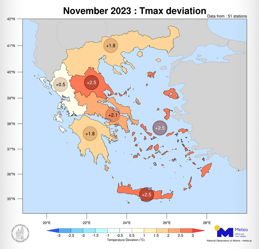 Όπως αναφέρεται σε σχετική ανακοίνωση, ο φετινός Νοέμβριος χαρακτηρίστηκε από πολλές ημέρες με θετικές αποκλίσεις θερμοκρασίας, και εκτός από τη δυτική και βόρεια Ελλάδα ήταν ο πιο θερμός Νοέμβριος από το 2010. Στη Θεσσαλία, στα νησιά του Αιγαίου και στην Κρήτη καταγράφηκαν οι μεγαλύτερες θετικές αποκλίσεις θερμοκρασίας, με τις μέσες μηνιαίες τιμές να κυμαίνονται 2,5 °C πάνω από τα κανονικά για την εποχή επίπεδα. Για τη Θεσσαλία, την Πελοπόννησο, την Κρήτη και τα υπόλοιπα νησιά του Αιγαίου ήταν ο πιο θερμός μήνας τα τελευταία 15 χρόνια, ενώ για τη Στερεά Ελλάδα ο δεύτερος πιο θερμός(+2,1 °C).