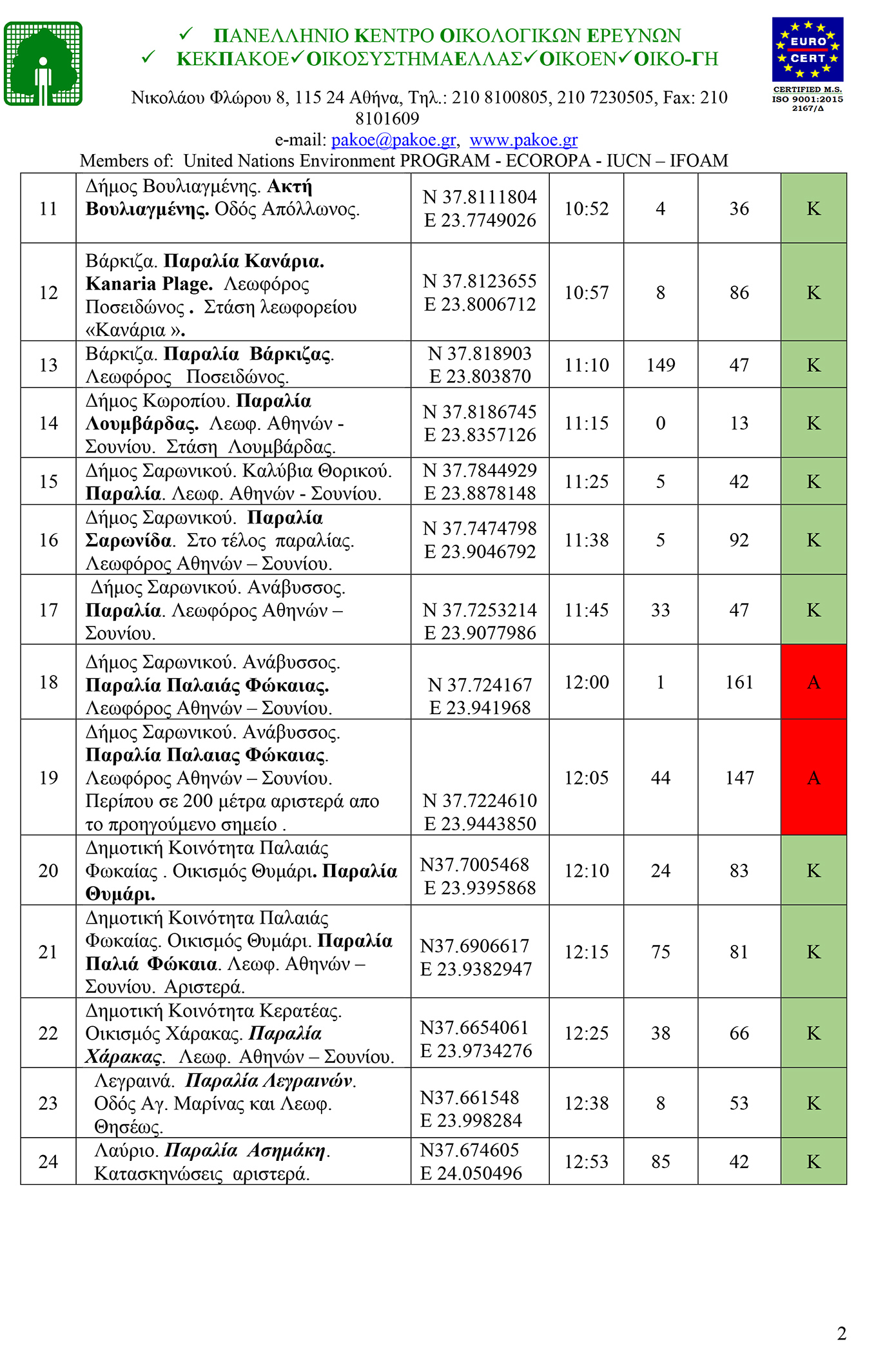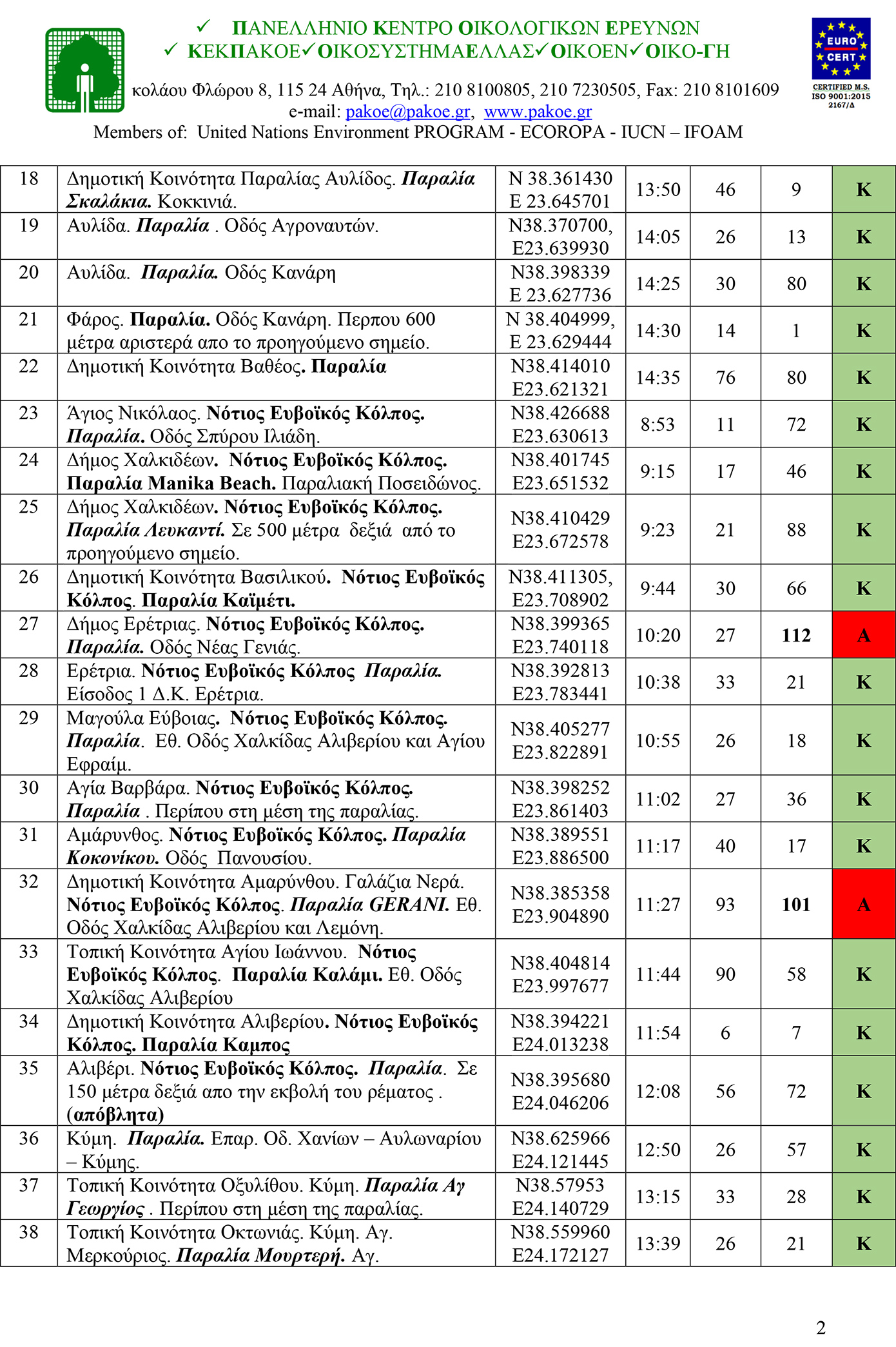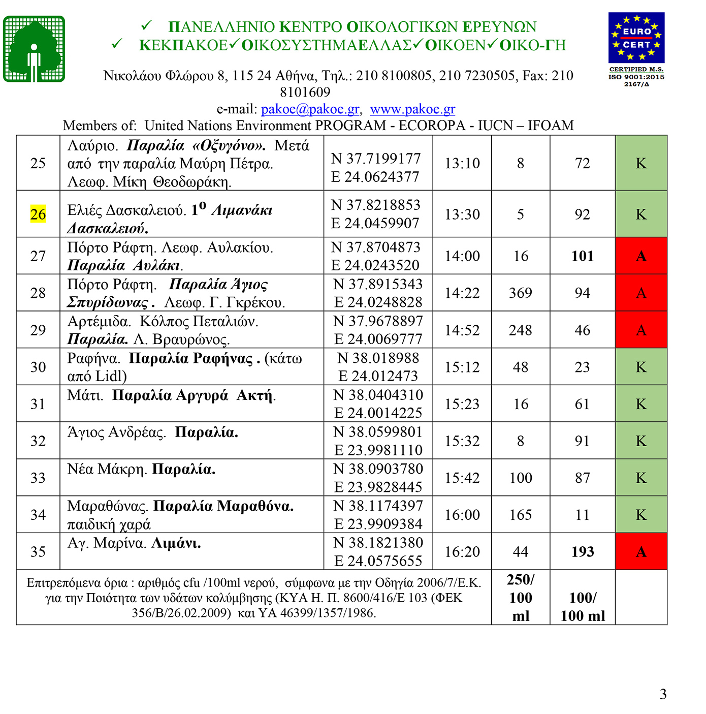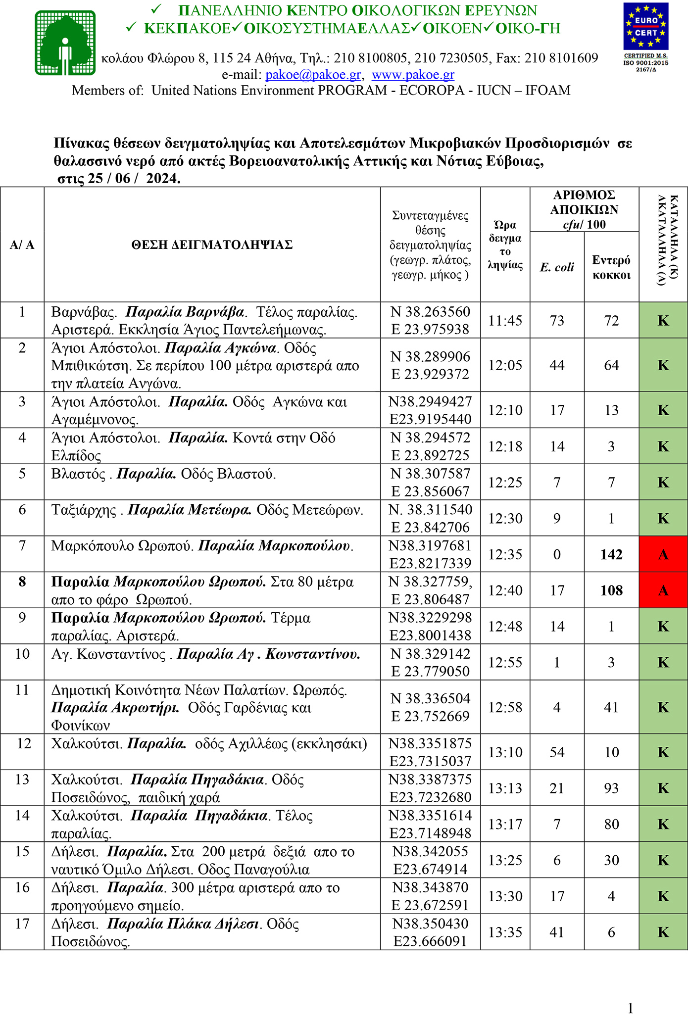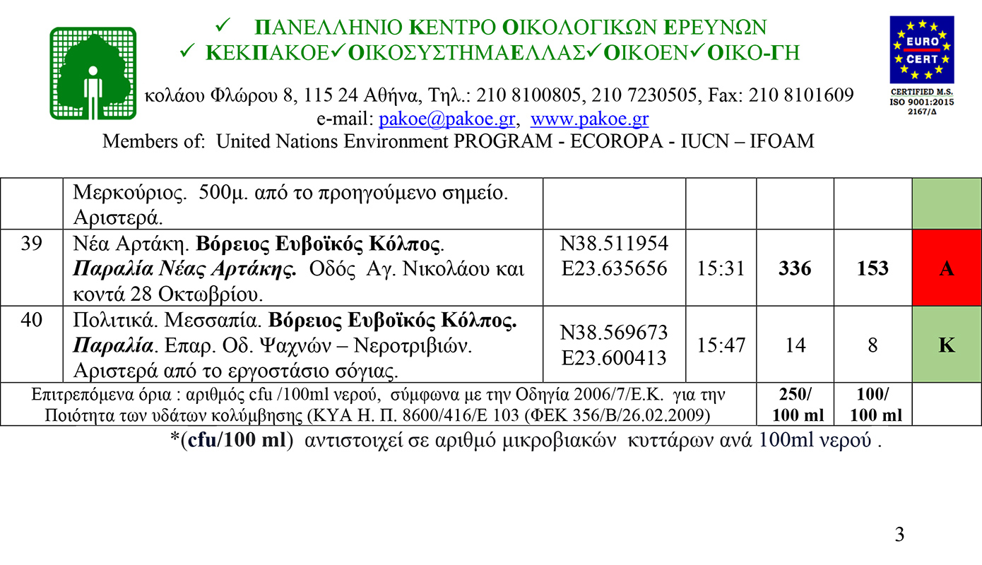 Παράλληλα, δημοσίευσε τα αποτελέσματα για την περιοχή από τις ακτές Βορειοανατολικής Αττικής και Νότιας Εύβοιας. Από τα 40 δείγματα που εξετάστηκαν τα 5, δηλαδή 12,5%, βρέθηκαν ακατάλληλα (Α) για κολύμβηση, ενώ τα 35, δηλαδή 87,5%, βρέθηκαν κατάλληλα (Κ) για κολύμβηση.