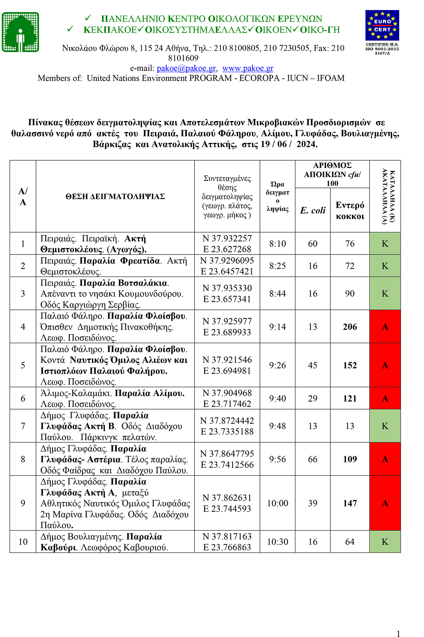 Ειδικότερα, το ΠΑΚΟΕ γνωστοποίησε τα αποτελέσματα από τις επαναληπτικές δειγματοληψίες για την περιοχή από τις ακτές του Πειραιά, Παλαιού Φαλήρου, Αλίμου, Γλυφάδας, Βουλιαγμένης, Βάρκιζας και Ανατολικής Αττικής.
