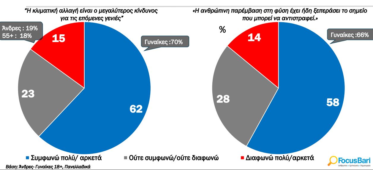 Τρεις στους πέντε Έλληνες ανησυχούν έντονα για την κλιματική αλλαγή, με τις γυναίκες (70%) να εκφράζουν υψηλότερα ποσοστά ανησυχίας. Το 62% θεωρεί την κλιματική κρίση τον μεγαλύτερο κίνδυνο για τις επόμενες γενιές, ενώ το 58% πιστεύει ότι η ανθρώπινη παρέμβαση έχει ξεπεράσει το σημείο επιστροφής.