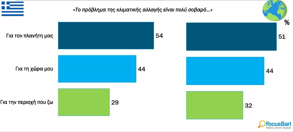 Το βασικό συμπέρασμα είναι πως, ενώ υπάρχει έντονη παγκόσμια ανησυχία για την κλιματική αλλαγή (75% δηλώνει ότι ανησυχεί πολύ ή αρκετά στην Ελλάδα και 80% παγκοσμίως), η αίσθηση κινδύνου αποδυναμώνεται όσο πλησιάζει το εθνικό και το τοπικό επίπεδο. Μόνο 44% των πολιτών ανησυχεί σοβαρά για τη χώρα και μόλις 29% για την περιοχή όπου ζει.